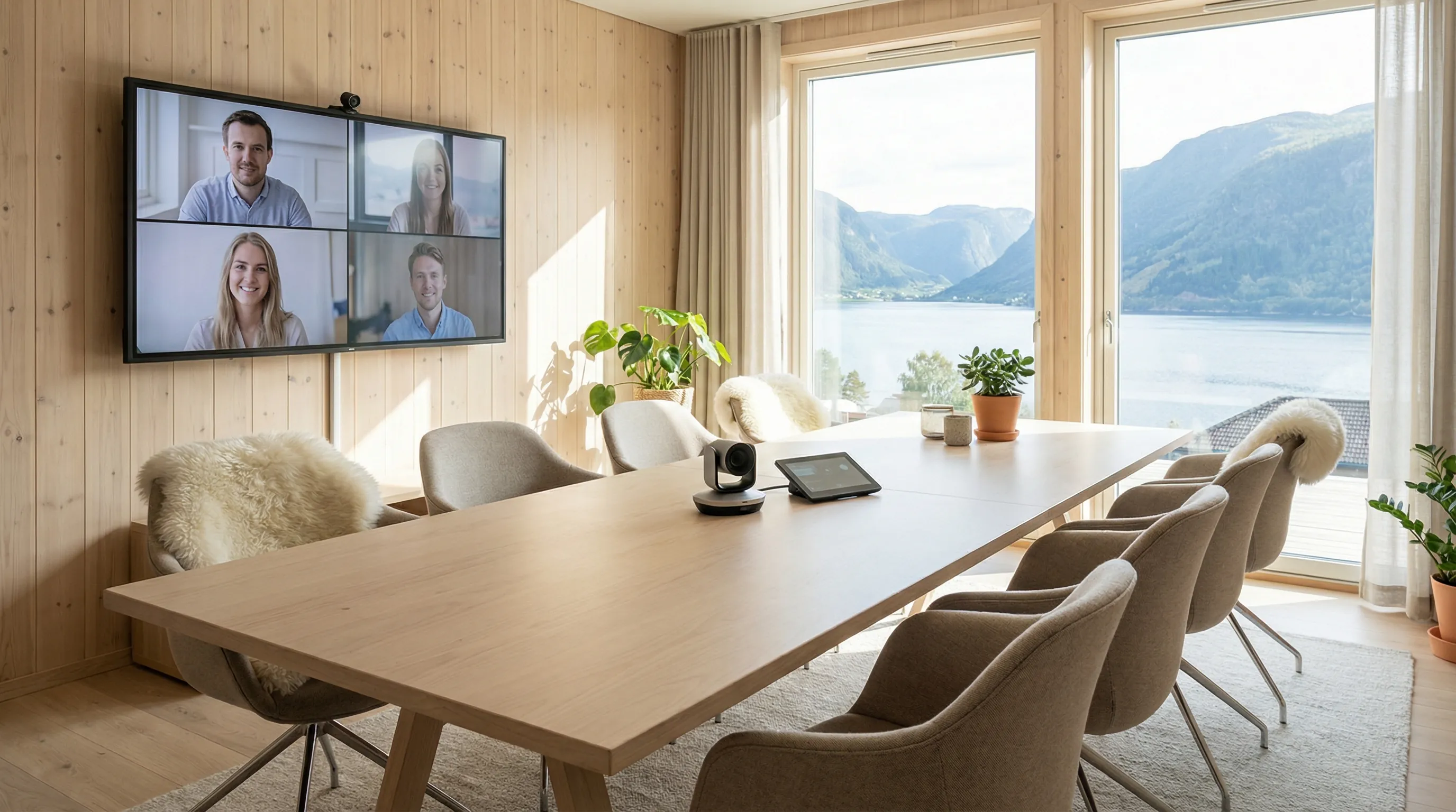 Komplett utstyr for moderne møterom med video, lyd og samarbeidsverktøy.