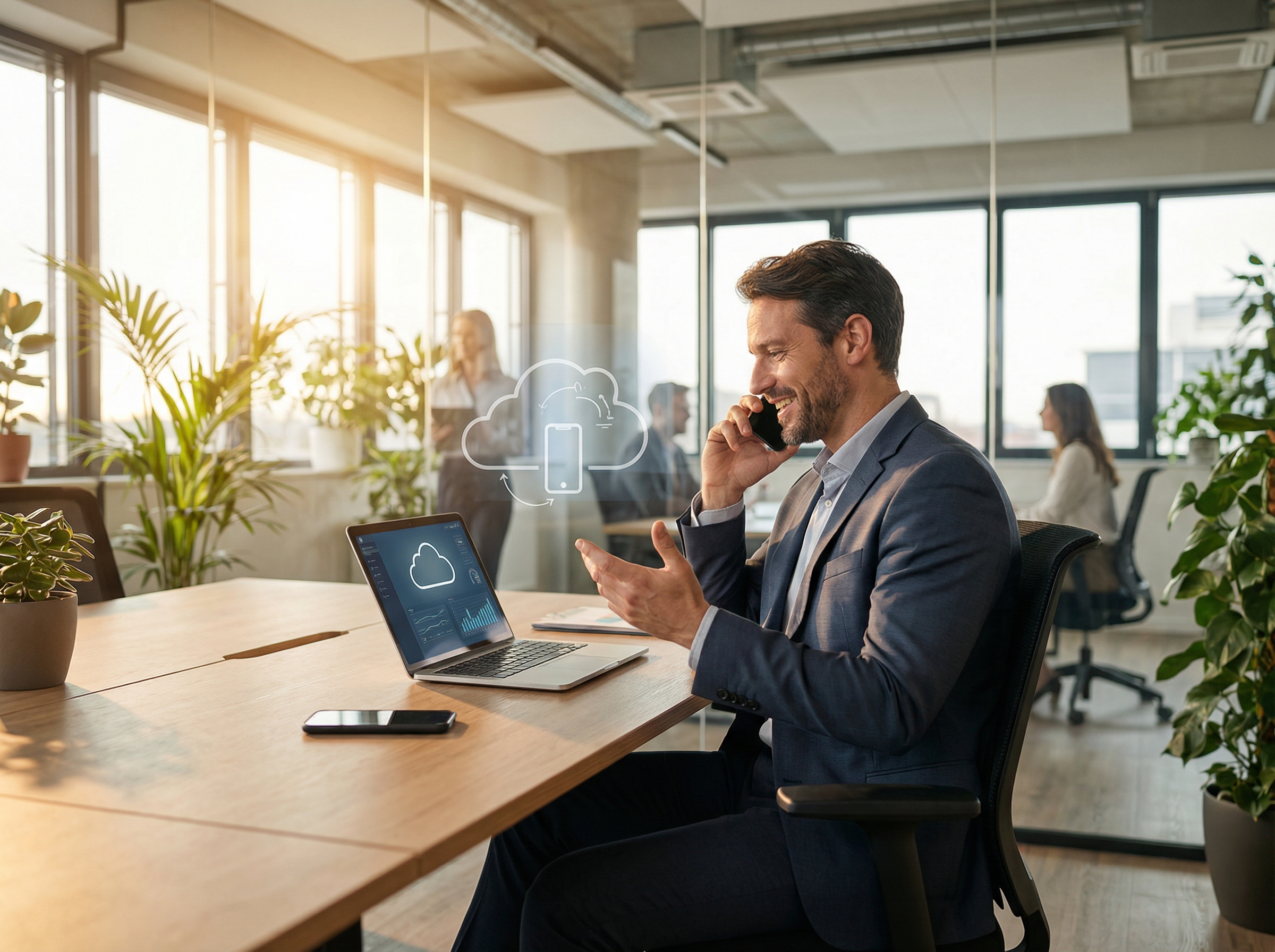 Tenk deg en telefonsentral, men uten boksen i serverrommet. Alt kjører i skyen. Ansatte tar bedriftssamtaler på mobilen – med bedriftsnummer som avsender. Samme kvalitet hjemme som på kontoret.